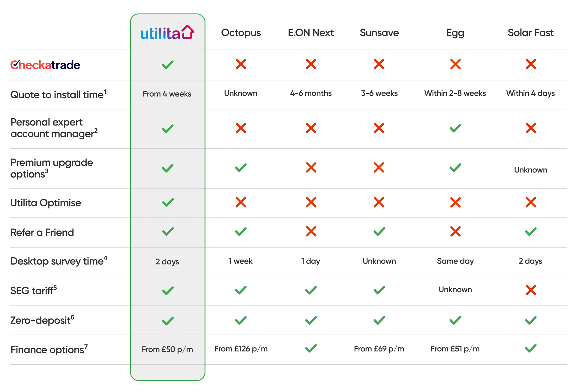 1The time period stated is the time from when a customer receives a quote to when their solar panels are installed onto their roof. We have used the following sources as the basis for our comparisons: Octopus, E.On Next, Sunsave, Egg, Solar Fast.